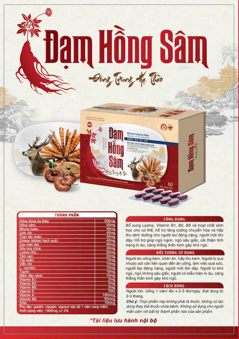 (HD) Đạm Hồng Sâm cao cấp-Hộp cứng 06 vỉ x 10 viên-Đông trùng-Nhung Huơu-Linh chi-tảo xoắn