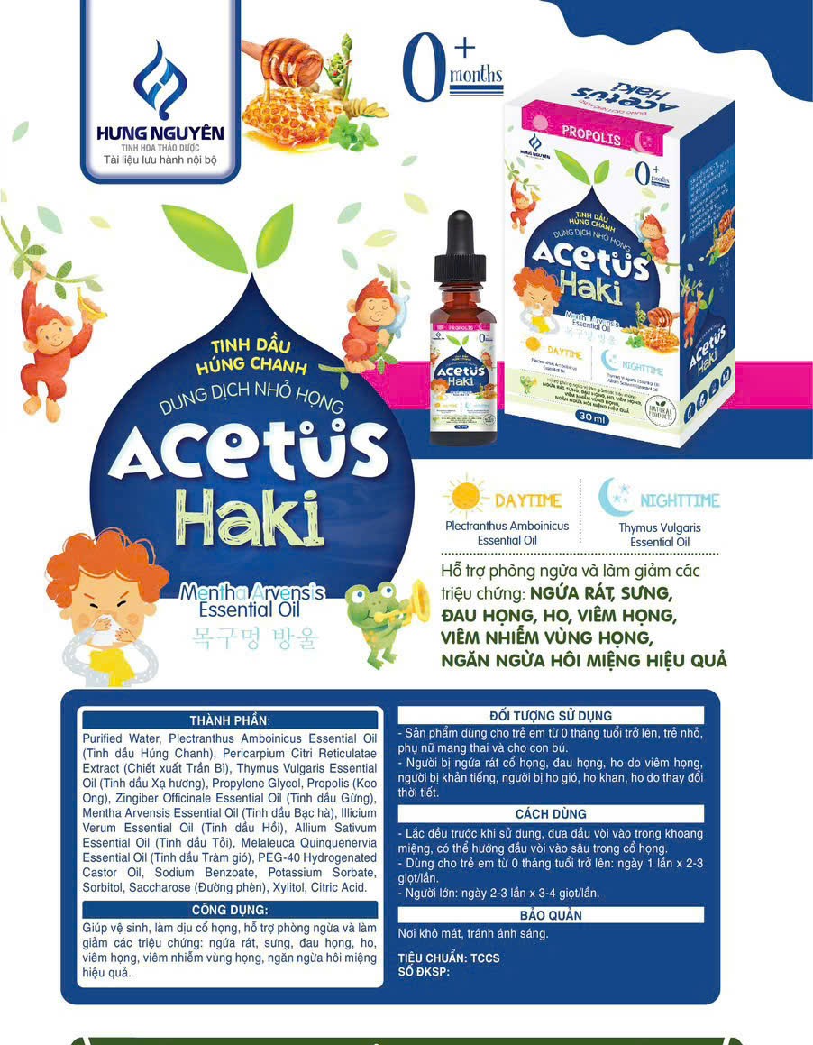 (HD) Dung dịch nhỏ họng Tinh dầu húng chanh lên men Acetus Haki-Cho trẻ từ 0 tháng giúp giảm rát cổ họng, viêm họng,ho gió ho khan, ho do thay đổi thời tiết